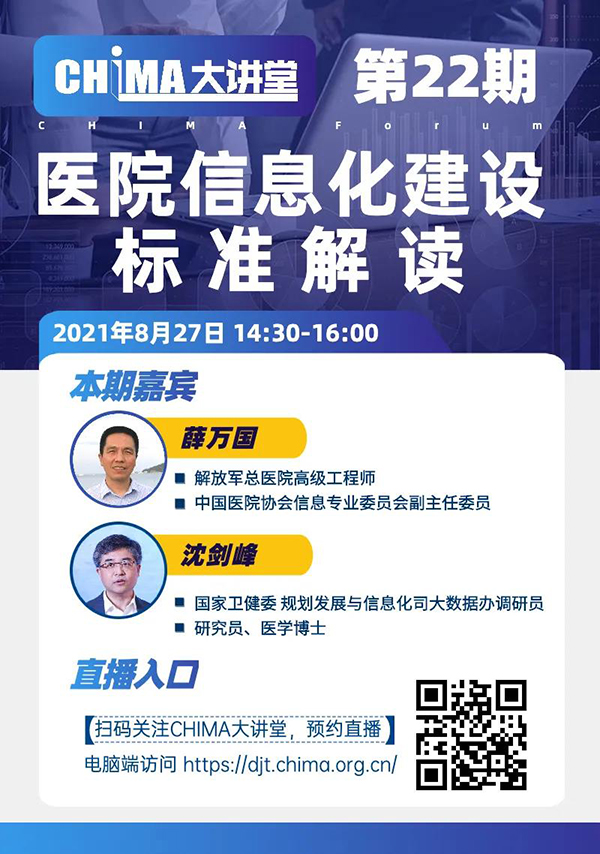 今天14:30,美彩国际大讲堂第22期“医院信息化建设标准解读”开讲。本期大讲堂特邀解放军总医院高级工程师薛万国主任、国家卫生健康委规划发展与信息化司大数据办调研员沈剑峰博士担任嘉宾,从政策和行业应用角度深入解读医院信息化建设标准。