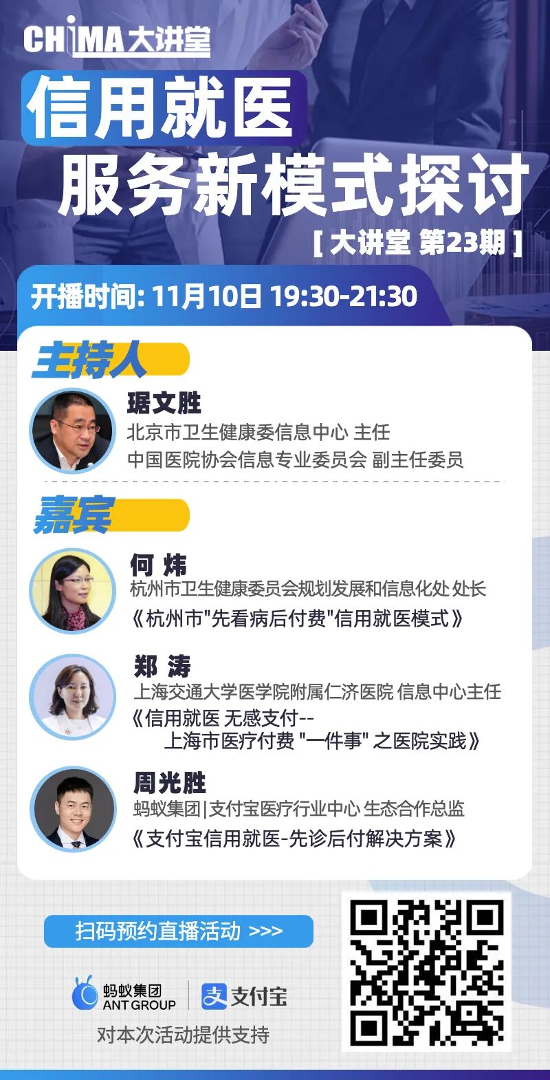 11月10日19:30,美彩国际大讲堂第23期聚焦“信用就医服务新模式”这一话题,邀请北京市卫生健康委信息中心主任、中国医院美彩国际信息专业委员会副主任委员琚文胜担任主持人,杭州市卫生健康委员会规划发展和信息化处处长何炜、上海交通大学医学院附属仁济医院信息中心主任郑涛、蚂蚁集团支付宝医疗行业中心生态合作总监周光胜将进行主题报告演讲,分别从政府、医院和企业角度分析探讨信用就医在医院的应用。